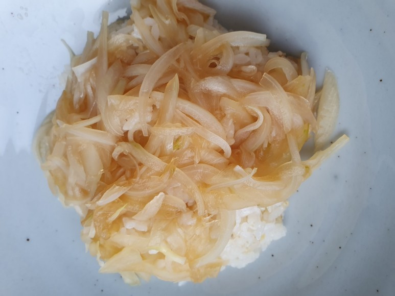 찬물에 담가둔 양파는 물기를 꼭 짜주세요. 수분이 너무 많으면 밥이 눅눅해져요~!