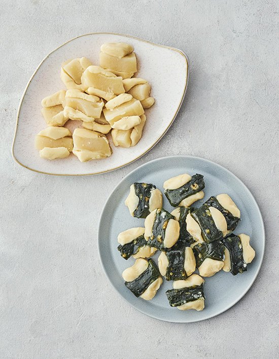 - 찹쌀가루 (200g) - 글루텐이 없어 쫄깃한 식감을 결정하는 주성분. 수분 흡수율이 일반 밀가루보다 30% 높음