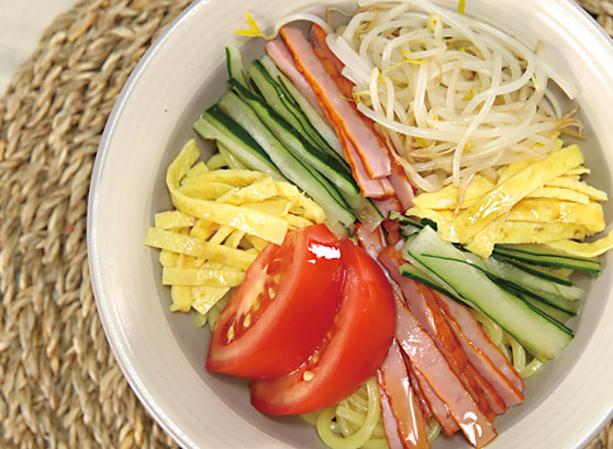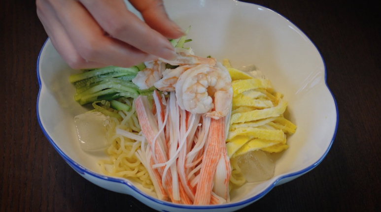 히야시츄카에는 다양한 고명을 올리는데요, 계란, 오이, 햄이 기본입니다. 각 재료들은 먹기 좋은 크기로 썰어 준비해 주세요. :)